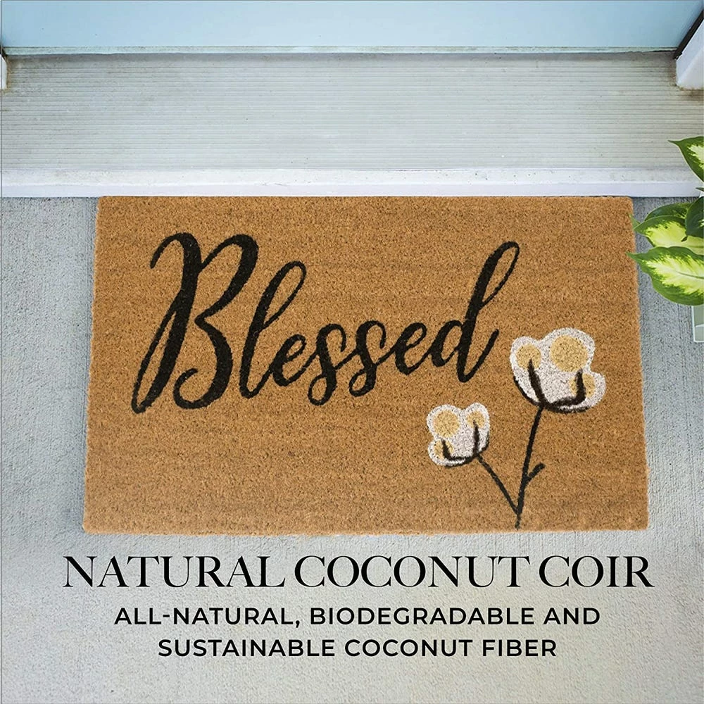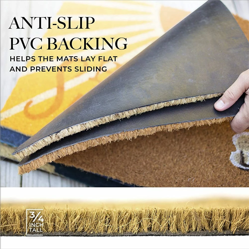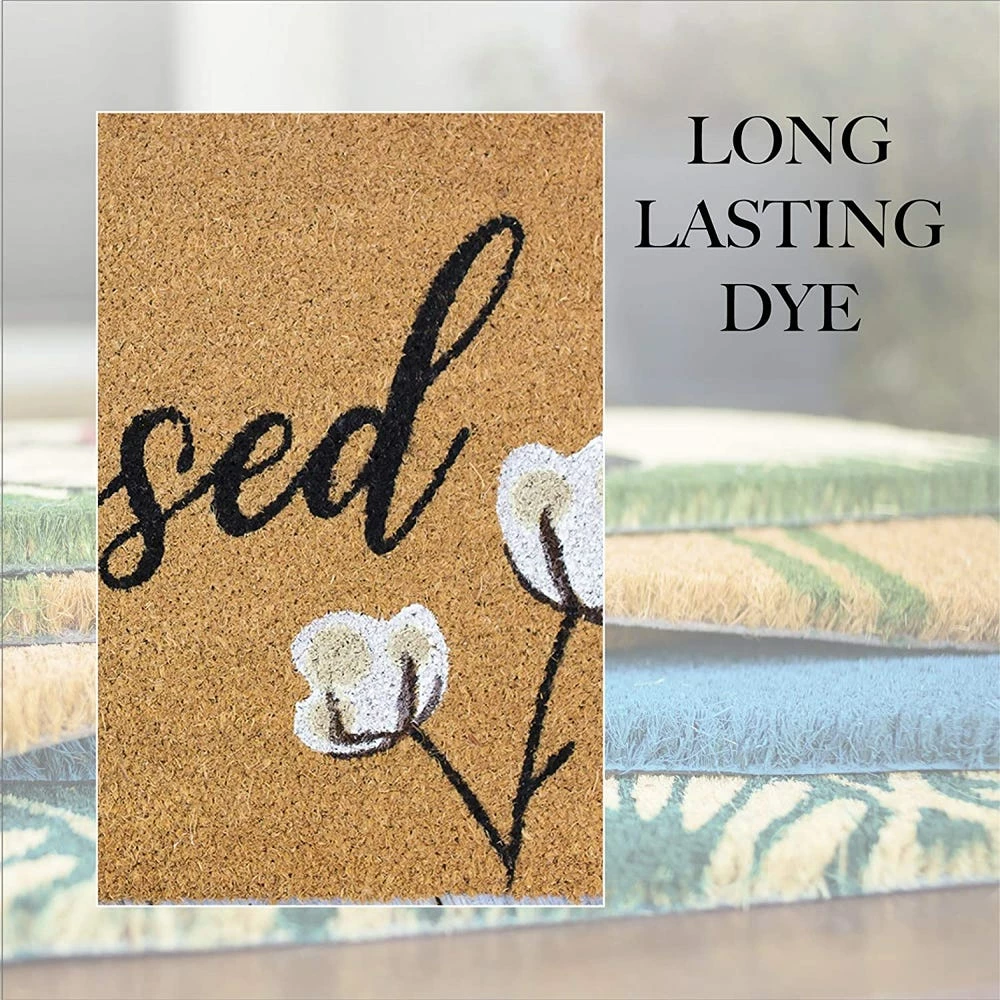 This entryway door mat is made of sustainable and renewable all natural coconut fiber and backed with vinyl for durability. The design is hand finished using permanent dyes for long lasting beauty.