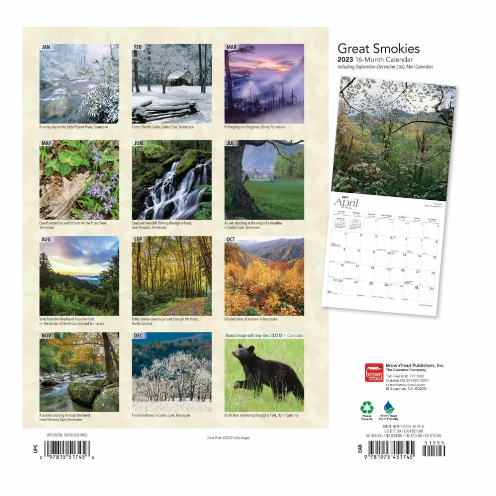 The Great Smoky Mountains, which rise on the border between North Carolina and Tennessee, stretch from the Pigeon River in the northeast to the Little Tennessee River in the southwest. This subrange of the Appalachian Mountains is home to Great Smoky Mountains National Park. This beautiful square wall calendar includes images of the Great Smokies’ ancient mountains, lush forests, and abundant plant and animal life.Â