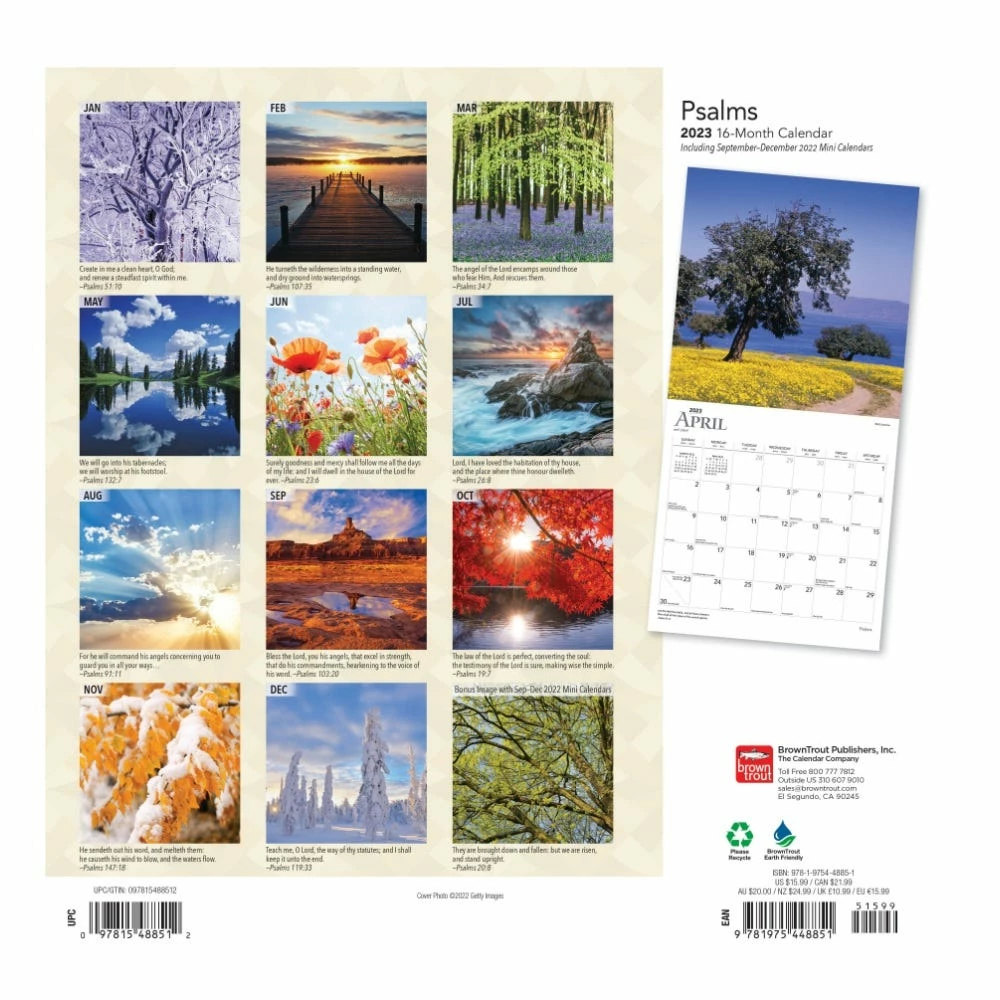 Sacred poems or hymns to God, psalms offer peace, solace, and inspiration to many. It is believed that King David wrote the 150 chapters of the Book of Psalms. In Hebrew they are known as Tehilim. The Psalms square wall calendar joins a collection of fine nature photography with a series of inspirational psalms.Â