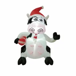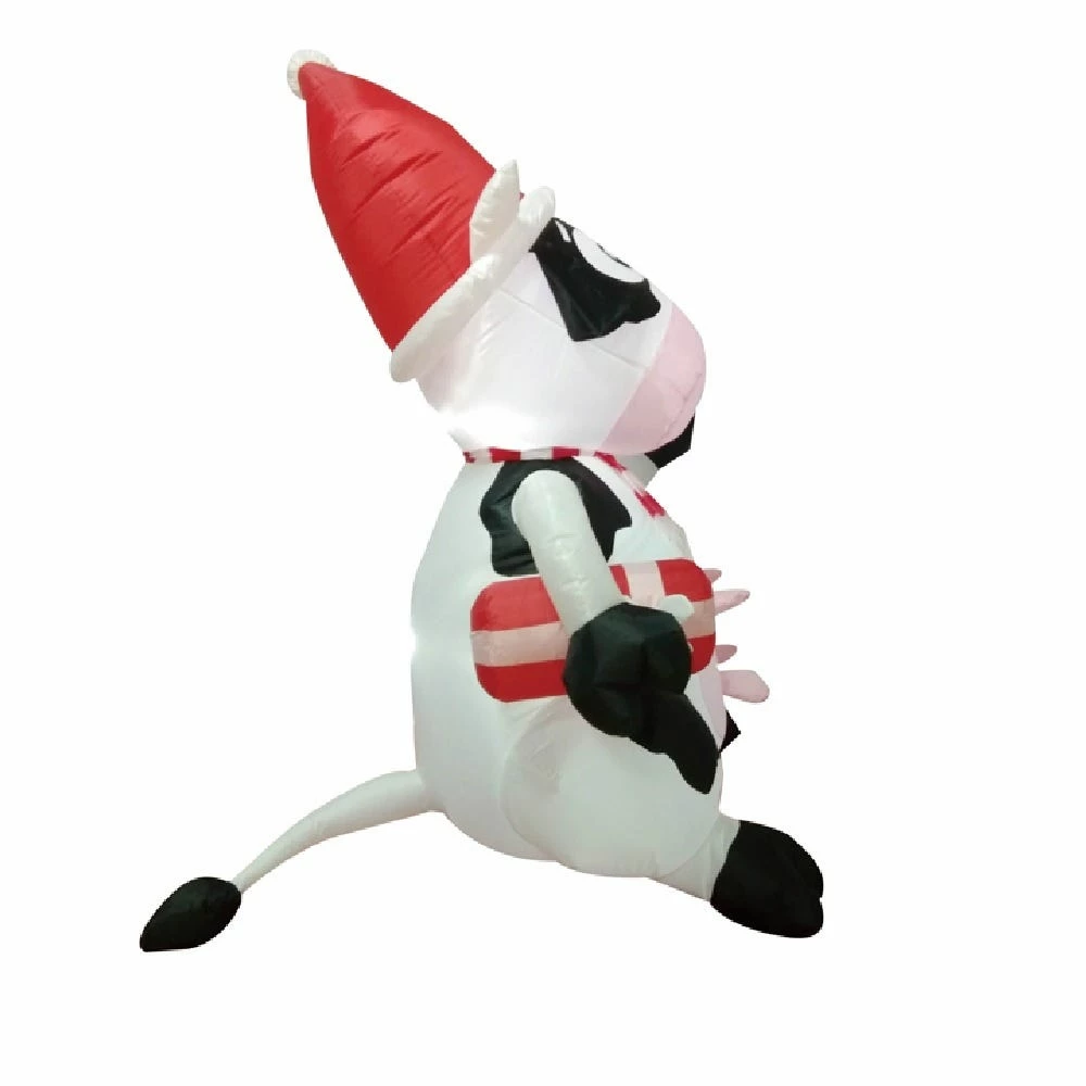 This inflatable cow is made of durable, weather-resistant polyester cloth. Decorate your home for Christmas with this adorable animal inflatable. It looks great day and night. Features a sitting Pig is wearing a Santa hat with a stripe scarf. It is internally led lighted for night time display. comes with metal stakes and tehter ropes to secure the item.