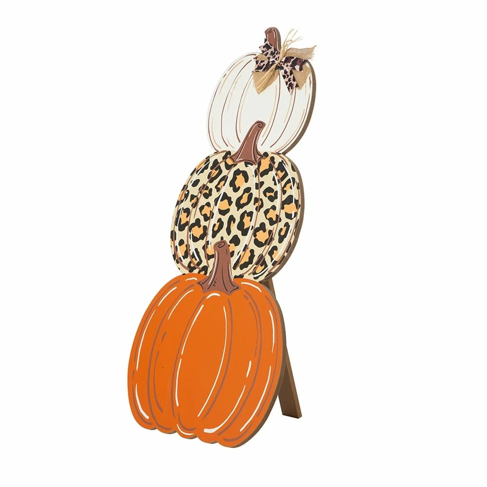 This is a wooden stack pumpkins porch leaner. It features in white pumpkin,leopard pumpkin, and orange pumpkin. The material is 100% MDF.