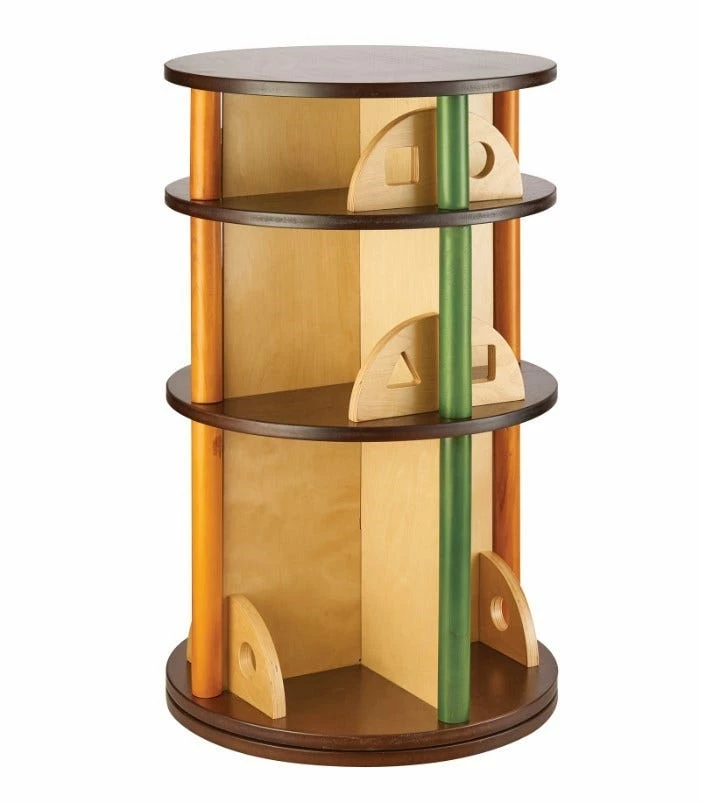 Featuring earth-toned panels and playful shapes, the See and Store Furniture Collection is ideal for all playrooms, bedrooms, or living rooms. 360° rotating carousel offers three different levels ideal for storing books, games, CDs and more. Unit features wood veneer panels with espresso, green, and orange accents, plus cheerful geometric shape cutouts inset on each level. Solid birch plywood construction with durable UV polyurethane finish.