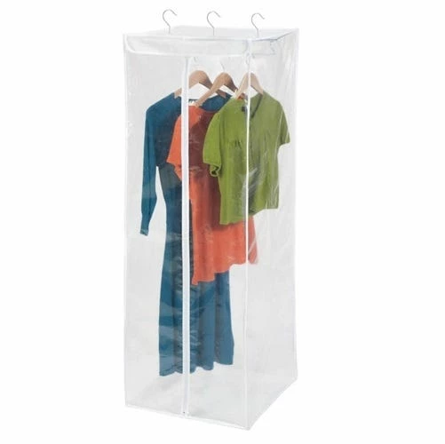Honey-Can-Do SFT-01414 Long Hanging Storage Closet, White / Clear. Protect your wardrobe investment with this hanging storage closet.  The breathable, white cloth material surrounds your wardrobe to prevent moths, musty odors, and dust or debris from damaging your  clothing. Measuring a sizable 54″ high x 19″ wide, you can easily fit up to 10 full length garments inside. A full-view, clear front with zipper closure allows you to easily see the contents. A heavy duty metal frame gives strength and support to heavy garments. Setup couldn’t be easier, just hang it from any standard closet rod and it’s ready to use.