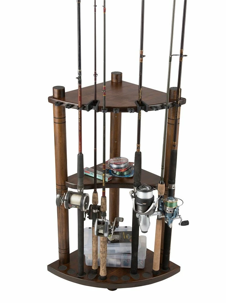 Those who are short on space, but big on style will love the way our 13-Rod Corner Rack perfectly fits the bill! Form meets function with quality distinctions like padded pole rests, accessory shelves. NEW dual rod technology and marine-grade/water-resistant finishes. This rack also comes with an extra adjustable storage shelf. Place one near the front door for grab-and-go convenience! The rack size is 17″ x 17″ x 33.5″.