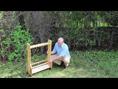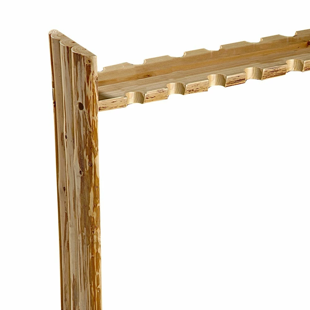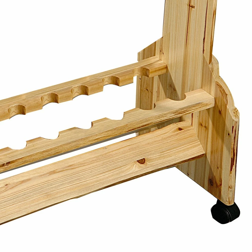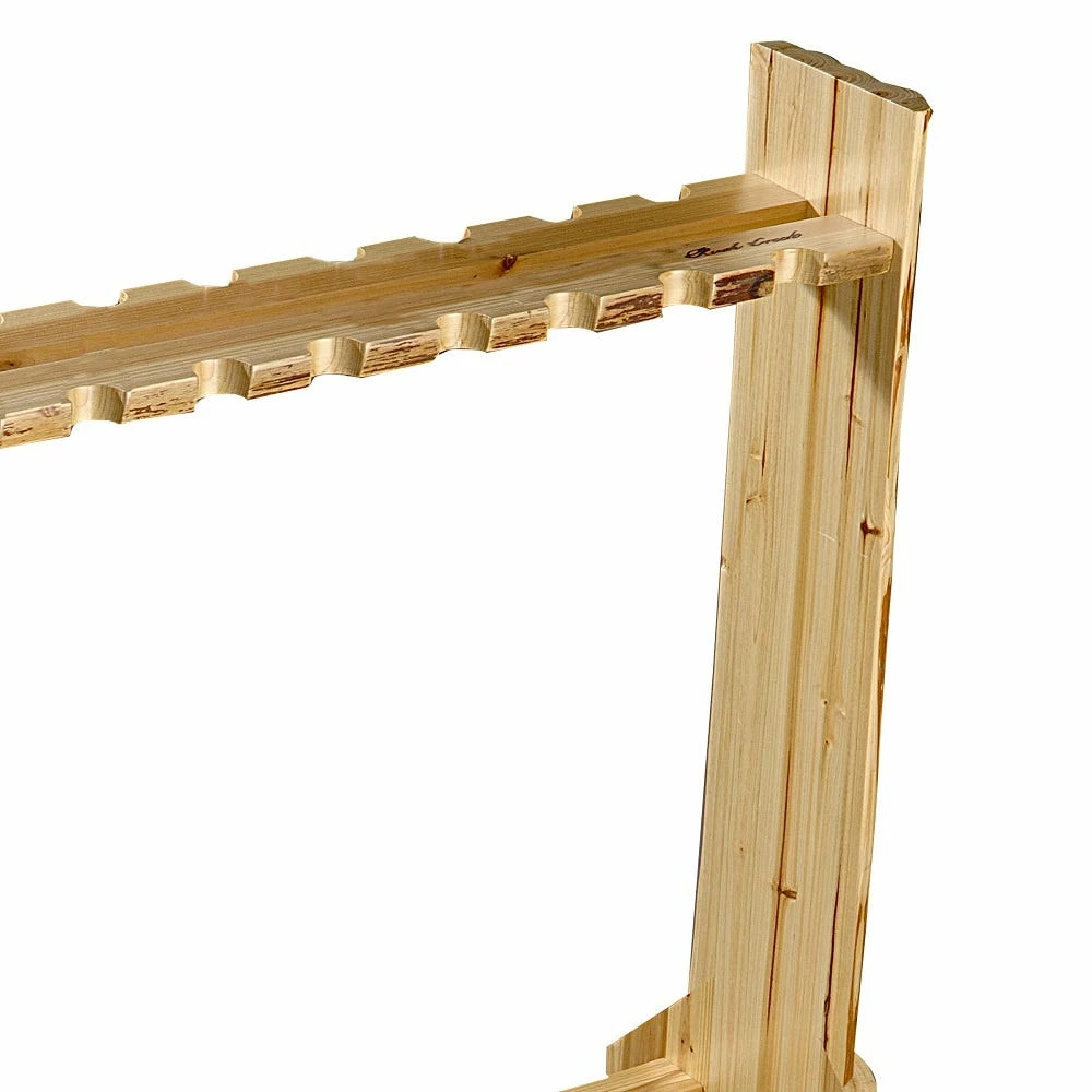 - Solid pine rolling fishing rod storage rack accommodates 16 rods