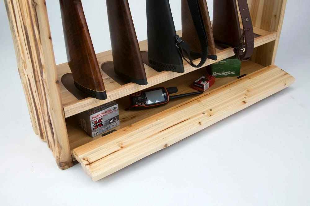 Secure and showcase your hunting supplies without sacrificing valuable space with this attractive Rustic Log 6 Gun Rack with Storage Drawer from Rush Creek Creations. This beautiful, solid pine rack secures and displays up to 6 rifles, shotguns, and other shoulder-shot firearms on a durable and attractive freestanding rack. The wood is given two varnish treatments composed of a skip-peel finish and a polyurethane treatment to protect both the rack and your equipment from scratches or dents without compromising the classic cabin style. The gun groove channels were designed so that each gun rests securely in its place, with the barrel rests lined with felt to protect your collection and guard against damage. A wide base features a handy storage drawer where you can keep ammo, gun oil, and other accessories alongside wherever you store and display your firearms. When assembled, the rack measures 34″L x 9.5″W x 42″H. With its rustic charm and durable, sturdy design, the Rush Creek Creations Rustic Log 6 Gun Rack with Storage Drawer is an essential item for any sportsman and hunting enthusiast. Includes 1 rack. Guns and accessories sold separately.
