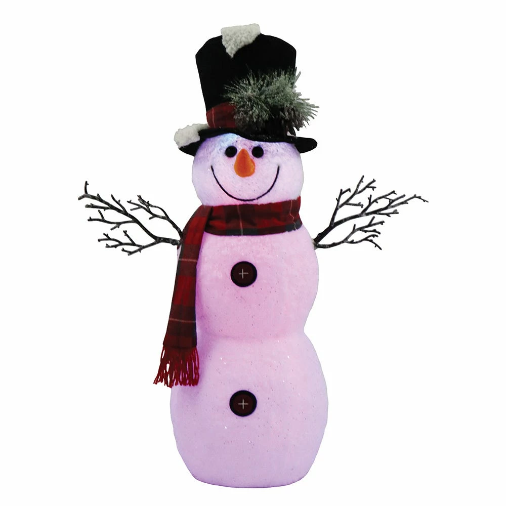 This Frosty the snowman definitely has a jolly, happy soul! Make your very own winter wonderland with this battery operated, tabletop snowman Christmas decoration, with color-changing LED lights. This amazing decoration looks incredible when unlit, but really creates a show when lit up, as the 8 multicolor LEDs flash through the snowman unique design. Perfect to display on a tabletop as part of a seasonal centerpiece, this high-quality decoration will be a real focal point within your display.Â