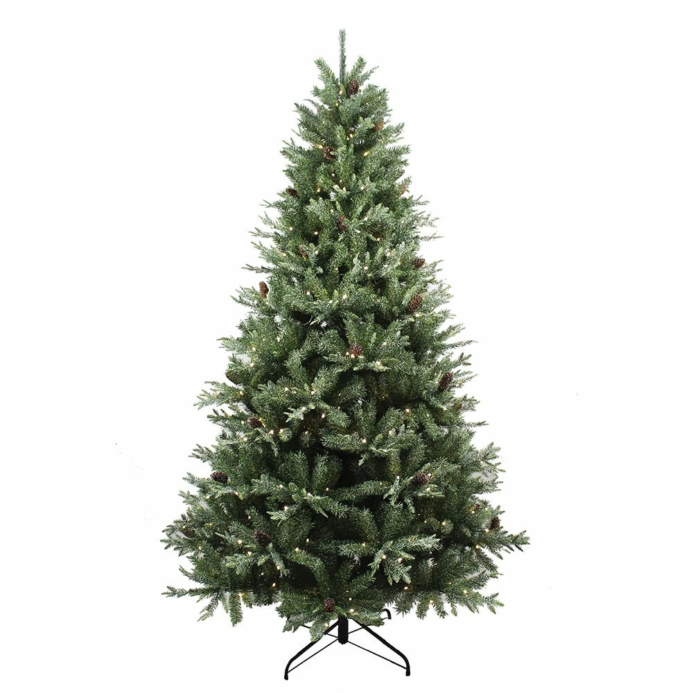 This 7.5′ Green Fir Artificial Christmas Tree features through-the-pole lighting system that eliminates the need for connecting multiple light strings, reducing set up time. These crush-resistant branch tips are molded from real tree branches for an authentic living tree appearance. This tree has a traditional Cone shape and is pre-strung with 450 UL warm white LED lights. This three-section tree features hinged branches for ease of assembly. Sturdy folding metal tree stand is included. Perfect addition to your holiday décor!