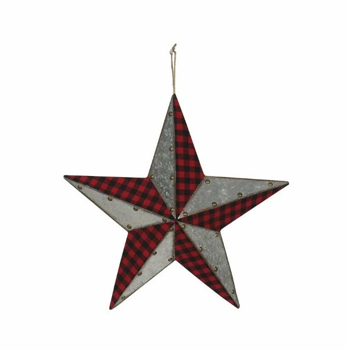 - The star features a galvanized upper half and a buffalo plaid bottom half with rivet details at the corners, The design makes a unique addition to your holiday decor anywhere in your home.