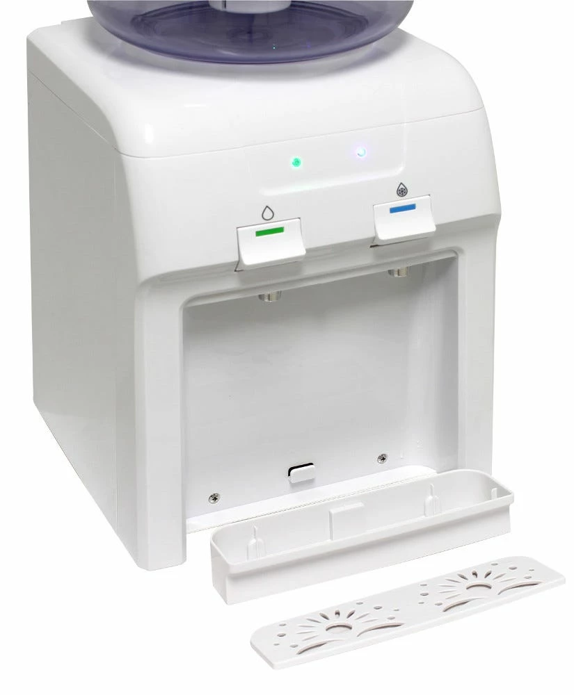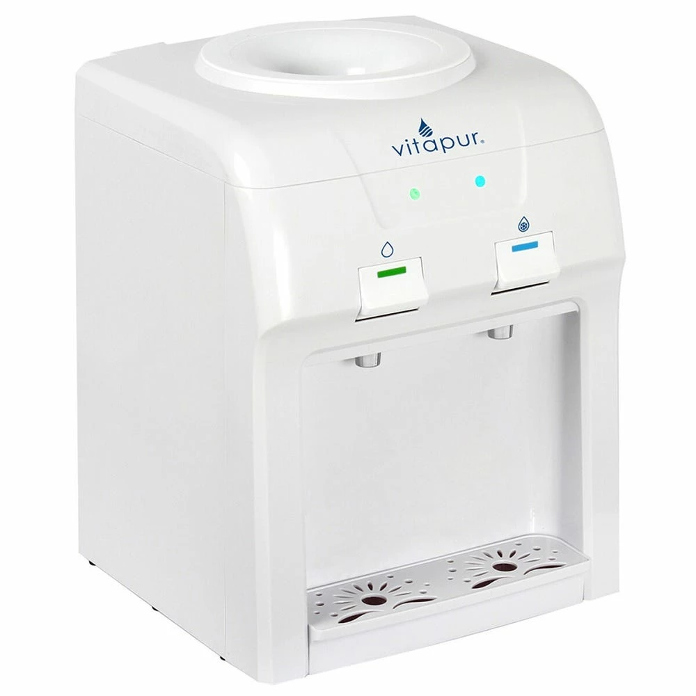 The Vitapur Countertop Water Dispenser features easy to use push button controls and dispenses cold and room temperature water. This compact design accommodates 3 or 5 gal water bottles and the semi-conductor electric cooling module provides whisper quiet operation. Convenient LED lights indicate power and when water has cooled to an ideal temperature. The removable drip tray & grill make clean up ease.