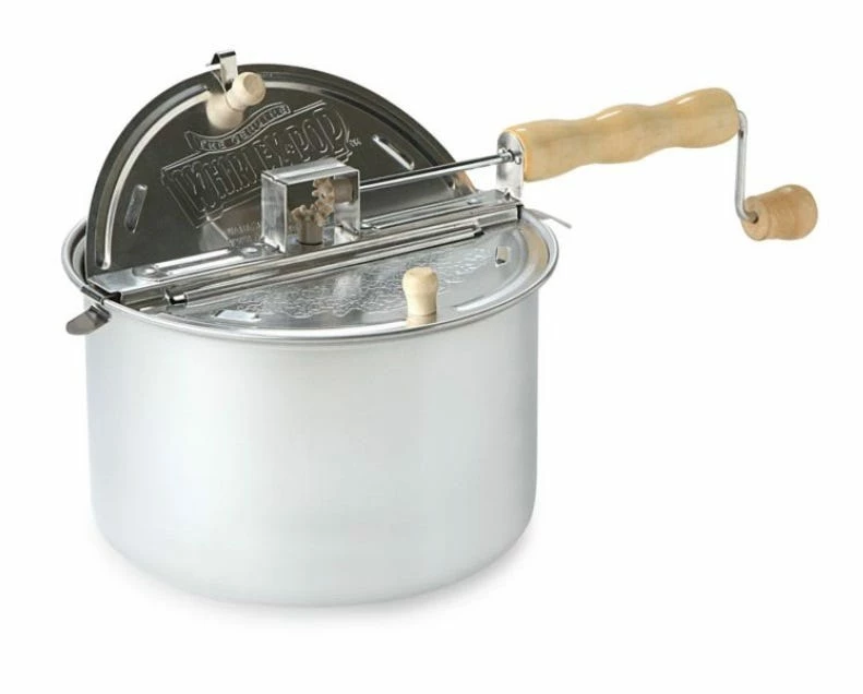 - Patented hand-crank mechanism continuously stirs the corn to evenly distribute the oil and to prevent burning