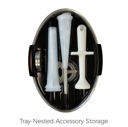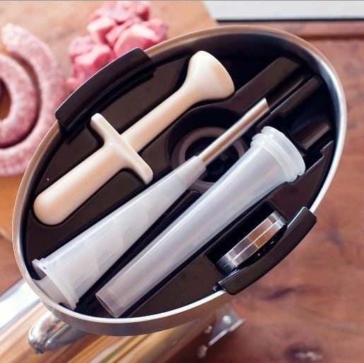 - Tray-Nested Accessory Storage for storing your plates, knife, stomper and sausage stuffing kit